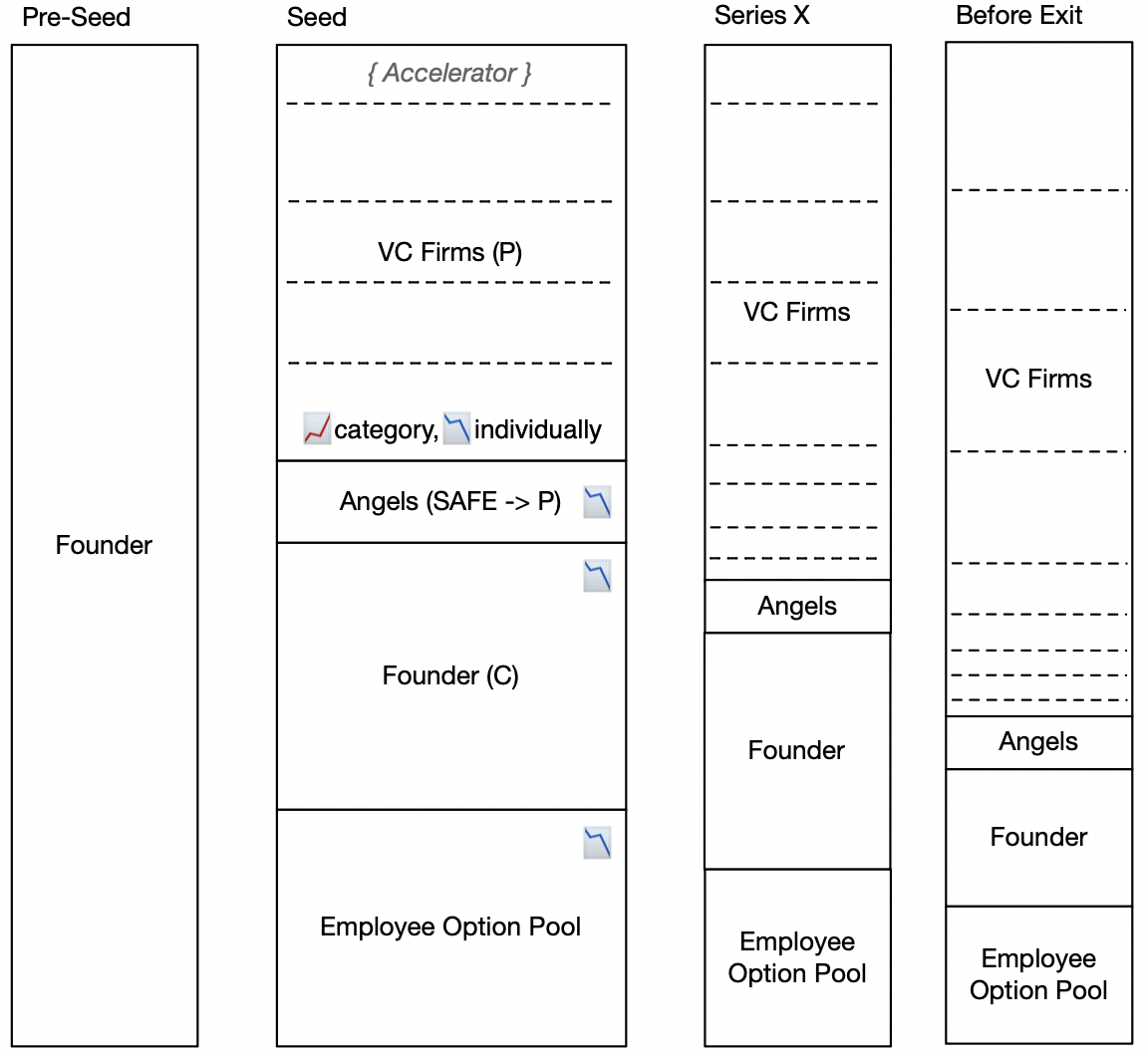 In the beginning, a company is owned by its founders. As the company’s board trades away equity and control for capital, the allocation of the cap table generally tends towards an 80/20 split between capital risk-takers (VCs) and labor risk-takers (Founders + Employees), mirroring the 80/20 split between LPs and GPs (see What’s a VC Firm?)